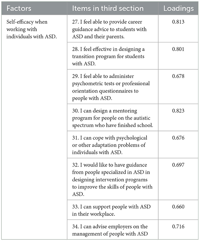To address the second aim of the study, our analyses have focused on Part C of the questionnaire, which referred to career counselors' beliefs about the challenges they face when working with individuals with ASD. The KMO measure of sampling adequacy was high (0.854), while Bartlett's test of sphericity showed significant correlations between the variables (χ2 = 301.088, p < 0.001). The exploratory factor analysis yielded a single overall factor that accounted for about 64 % of total variance (χ2/df = 2.02; CFI = 0.91; RMSEA = 0.072; SRMR = 0.061). Table 5 below presents the items included under the single factor that centered on career counselors' self-efficacy when working with individuals with ASD. The Cronbach's a was calculated (a = 0.800).