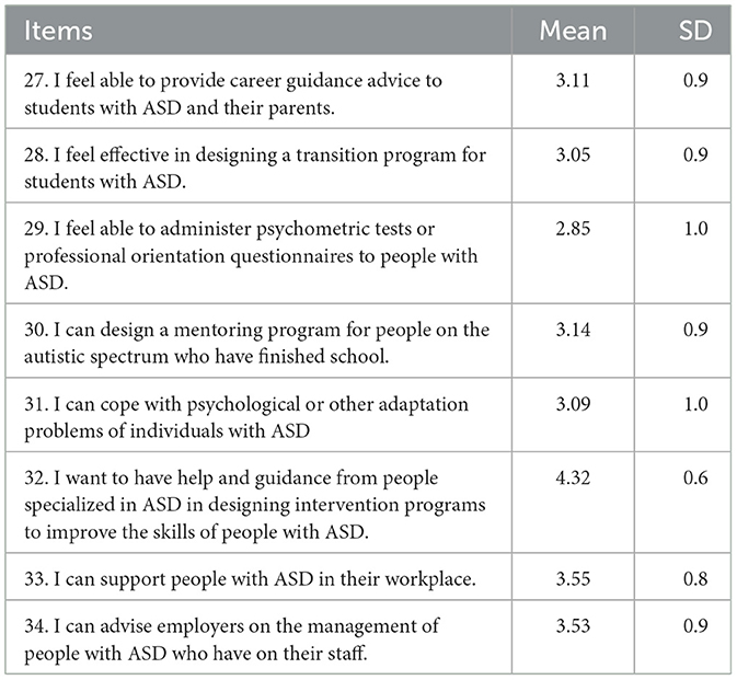 We next provide descriptive statistics summarizing response rates based on answers that focused on the career counselors‘ beliefs about their self-efficacy when working with individuals with ASD, and how prepared they felt to support them (see Table 6). Respondents expressed low confidence in administering psychometric tools (M = 2.85, SD = 1.0) (item 29), but a strong desire for ASD-specific training (M = 4.32, SD = 0.6) (item 32). Overall, it seems that career counselors' self-perceived readiness to offer support services to people on the spectrum received rather moderate agreement rates (items 27, 28, 33, and 34).