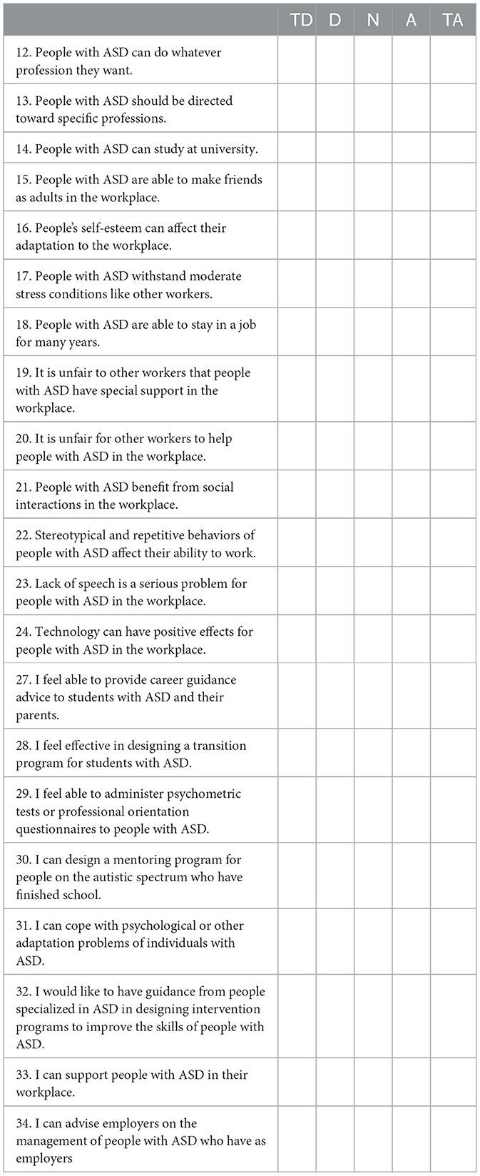 The items refer to people with high-functioning ASD. The options are: TD: Totally Disagree, D: I disagree, N: I'm Neutral, A: Agree, TA: Totally Agree