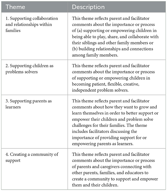 Through analysis, we identified four themes related to potential shared problems of practice that were repeatedly mentioned by both families and facilitators and were woven into the fabric of the group process: (a) supporting collaboration and relationships within families, (b) supporting children as problems solvers, (c) supporting parents as learners, and (d) creating a community of support (see Table 1). These four themes were present across all meetings and seemed to connect deeply with the needs and values that parents prioritized for their families. The four themes were related to the project's focus on engineering and executive function, but they were also broader, reflecting a more holistic view of children, families, and community. Some of the themes were initially introduced by the group facilitators and then echoed and expanded on by parent participants. Others were introduced by the parents themselves and then incorporated into subsequent discussions as the facilitators adapted to parents' interests and priorities.