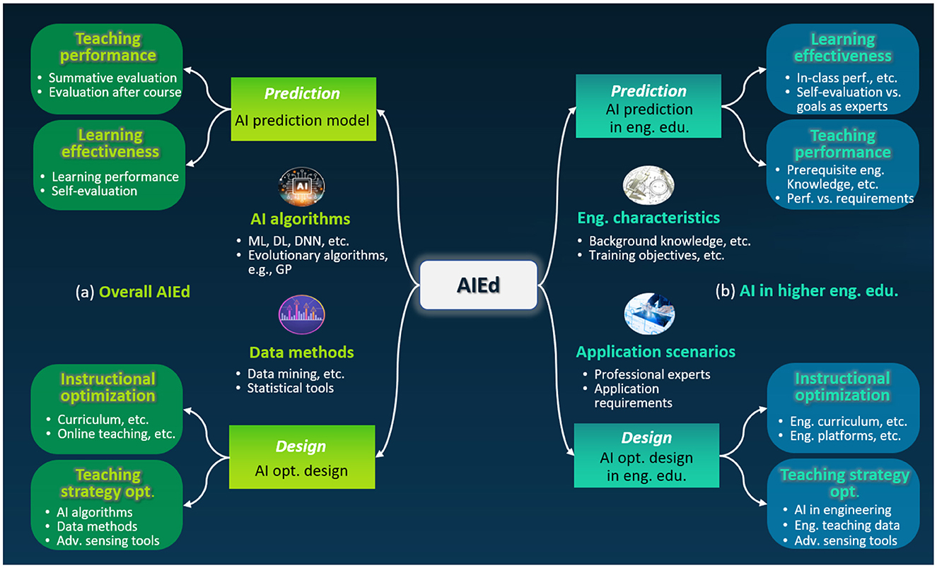Figure 1. Current progress of AIEd. Four aspects of teaching performance, learning effectiveness, instructional optimization and teaching strategy optimization in (a) overall AIEd that is generalized for all subjects, and (b) AI in higher engineering education that is specialized for the characteristics and application scenarios of engineering courses.