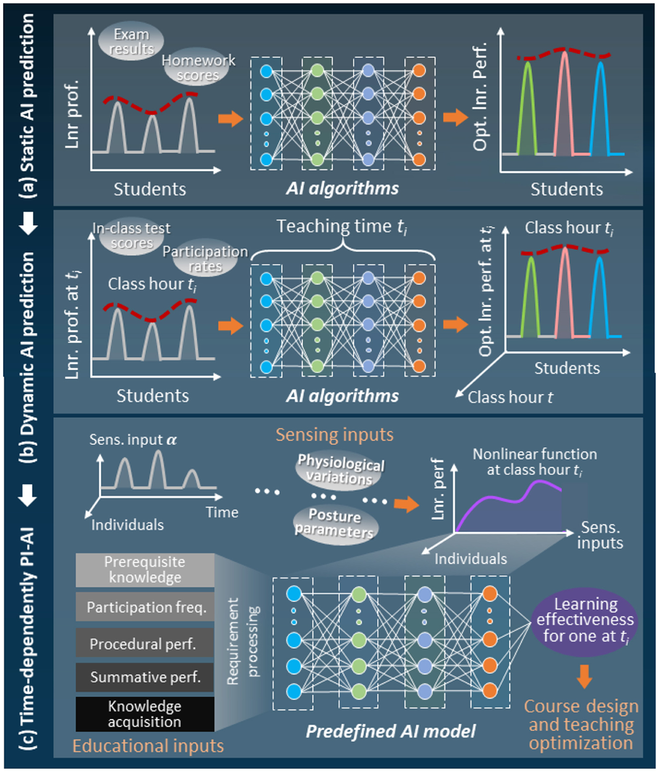 Figure 2. Strategy shifting of AI models for learning performance prediction in higher engineering education. It illustrates the evolutionary trajectory of AI-based strategies for predicting student learning performance and supporting teaching optimization in higher engineering education, spanning three key developmental stages: (a) initial static AI prediction models: These models lack the capability of temporal update, relying on fixed historical learning data for one-time prediction. (b) Recent dynamic AI prediction models: compared with static models, these models introduce class hour-based correction mechanisms. (c) Emerging time-dependently individual Performance-Informed AI (PI-AI) models: these models achieve real-time adaptive updates by sensing key individual performance indicators across different class hours.