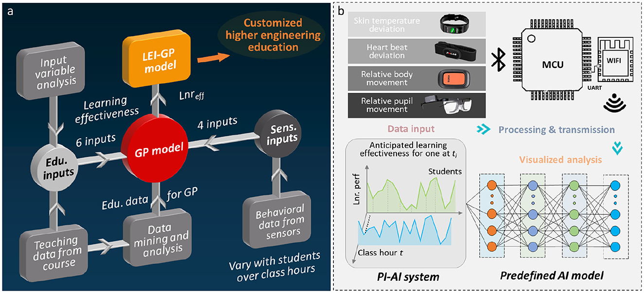 Figure 3. Development procedures of the time-dependently LEI-GP model for PI-AI system. (a) The existing GP model is extended to customized higher engineering education by incorporating sensing inputs (i.e., STd, HBd, POSrm, POSpm) that are automatically updated over class hours t. (b) The operational workflow and anticipated learning outcomes of the PI-AI system.
