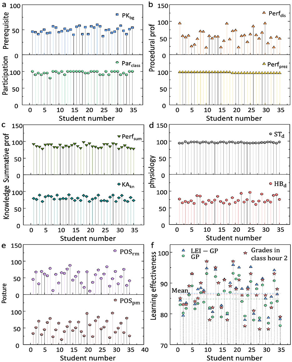 Figure 4. The input data and prediction outcomes of the time-dependently LEI-GP model during class hour 2. (a–e) The input data used to predict student learning effectiveness during class hour 2, comprising eight educational inputs and four sensing inputs. (f) Comparison of the predicted student learning effectiveness for the class hour 2 generated by the LEI-GP and GP models, as well as the actual student scores obtained during the class hour 2.