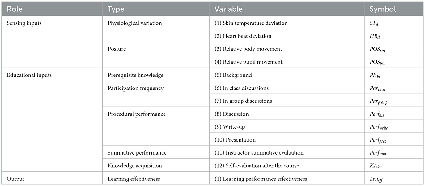 To showcase the application of PI-AI in higher engineering education, here we develop a learning effectiveness-informed genetic programming (LEI-GP) model to showcase the customized prediction (i.e., updated with students and class hours) in a higher ocean engineering course. The time-dependently individual LEI-GP model is developed based on Smart Marine Metastructures—a course offered by the author in Spring semester (32 h 2 credits in 8 weeks) at Zhejiang University, China. In particular, the course was offered as online-and-offline hybrid, where the online classroom was built on the DingTalk (Zoom-like platform in China) and the blackboard online platform (XueZaiZheDa http://course.zju.edu.cn/). The participants included 35 full-time master and PhD candidates in the Ocean College at the university, who were all Chinese aged from 22 to 27 years old with the gender distribution of male-to-female as 24:11. The key performance of the students is characterized into the two groups of sensing and educational inputs. The former is further classified into five categories (i.e., the prerequisite, participation, procedural performance, summative performance and knowledge acquisition) and the latter is classified into the skin temperature and heart beat deviations in physiological variations and relative body and pupil movements in postures. The output variable is defined as the learning effectiveness Lrneff of the graduate students in the course, as listed in Table 1. Previous study reported the GP prediction model to define the relationship between the educational inputs and learning effectiveness as (Jiao et al., 2022),