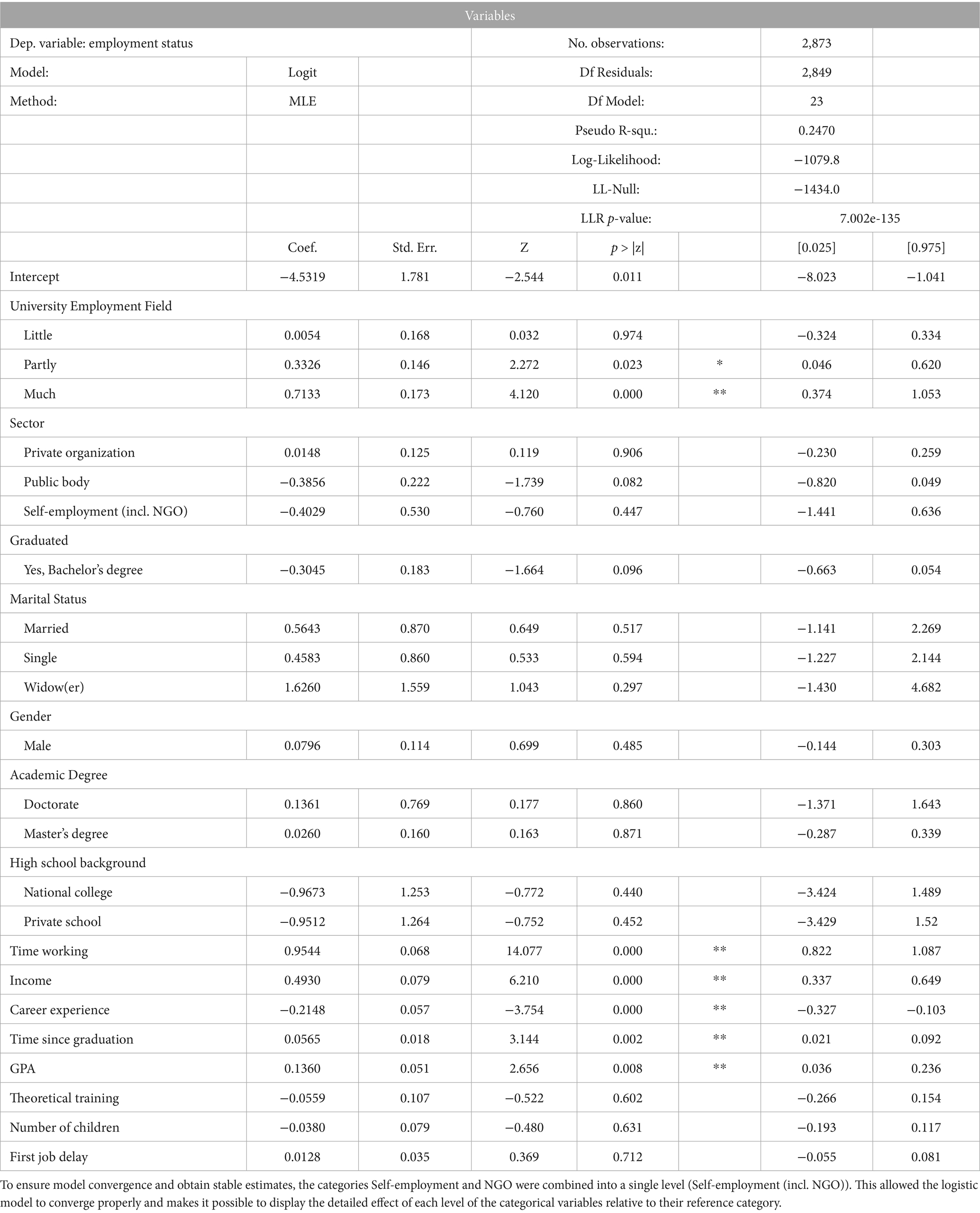 Citation: Portocarrero Ramos HC, Campos Trigoso JA, Cruz Caro O, Reina Marín Y, Maicelo Guevara JL, Sánchez Bardales E and Chávez Santos R (2025) Career paths and university education: factors that determine the employment status of university graduates. Front. Educ. 10:1664249. doi: 10.3389/feduc.2025.1664249