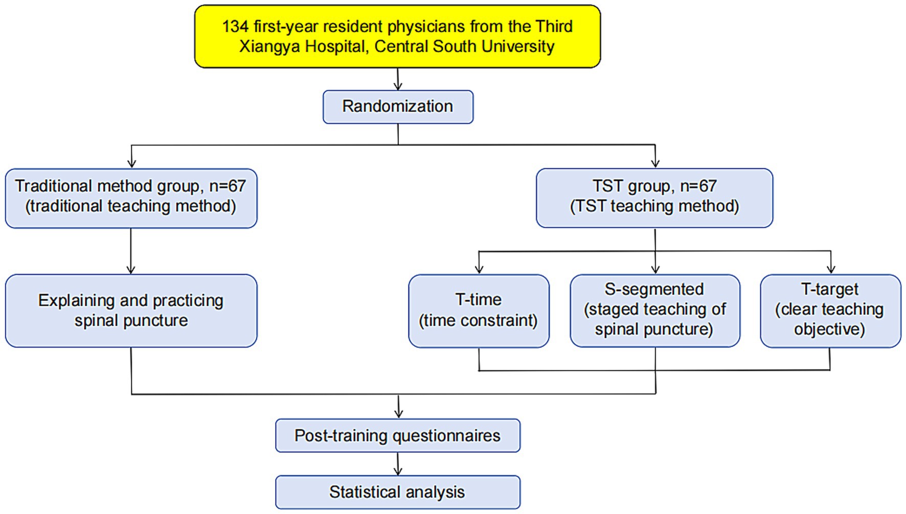 This study was a randomized trial. In this study, we applied the TST teaching method to the teaching of “spinal puncture” in the resident physician training course. All participating resident physicians were randomly assigned to either the traditional method group or the TST group through a random number table approach (Figure 1). The traditional method group was taught using the traditional teaching method, while the TST group was educated utilizing the TST teaching method. Each group was instructed by an experienced anesthesiology teacher. Both teachers had completed the resident physician teacher training, a program certified by the Chinese Medical Doctor Association. Both instructors were supplied with detailed lesson plans to follow. They meticulously prepared the lessons before each class, and actively involved their students through asking questions in class. The teaching courses for both groups of students spanned an identical duration of 4 h. A 10 min intermission was scheduled after every 45 min of instruction. All of these courses were conducted in the science and education building of the Third Xiangya Hospital. Each instructor was responsible for guiding 16 to 17 students per class, resulting in a teacher-to-student ratio of 1:16–17.