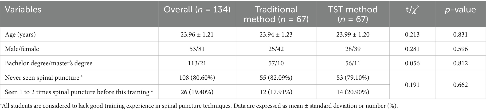 A total of 134 participants took part in the study. Following the spinal puncture course, all participants independently filled out a questionnaire. There were no significant statistical differences in demographic characteristics, including age, gender, and educational level between the traditional method group and the TST method group (p > 0.05) (Table 1). Additionally, Table 1 illustrates the participants’ prior knowledge of spinal puncture techniques. A majority of 80.60% (108/134) had never observed an spinal puncture procedure, while 19.40% (26/134) had witnessed it 1 to 2 times prior to the training. None of the participants had any hands-on experience with spinal puncture procedures. There was no record of any specific adaptations made to educational intervention.