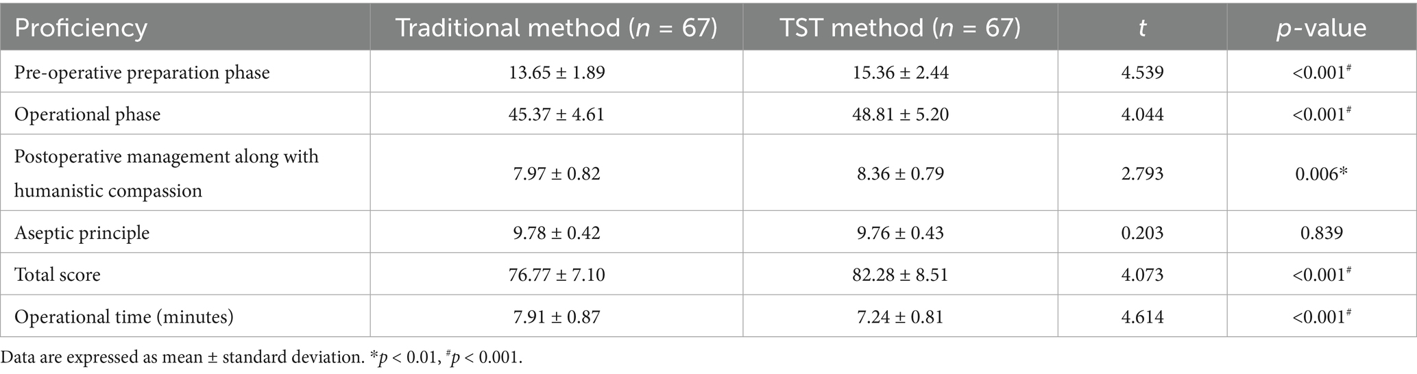 Results: The TST group demonstrated significantly higher competency scores in the pre-operative preparation phase, the operational phase, postoperative management along with humanistic compassion, and total scores (p < 0.01 for each pairwise comparison). Concurrently, the TST group exhibited shorter operational times, and better retention of skills over time (p < 0.01 for each pairwise comparison). Additionally, participants in the TST group reported higher levels of proficiency, willingness, confidence, and satisfaction with teaching (p < 0.01 for each pairwise comparison).