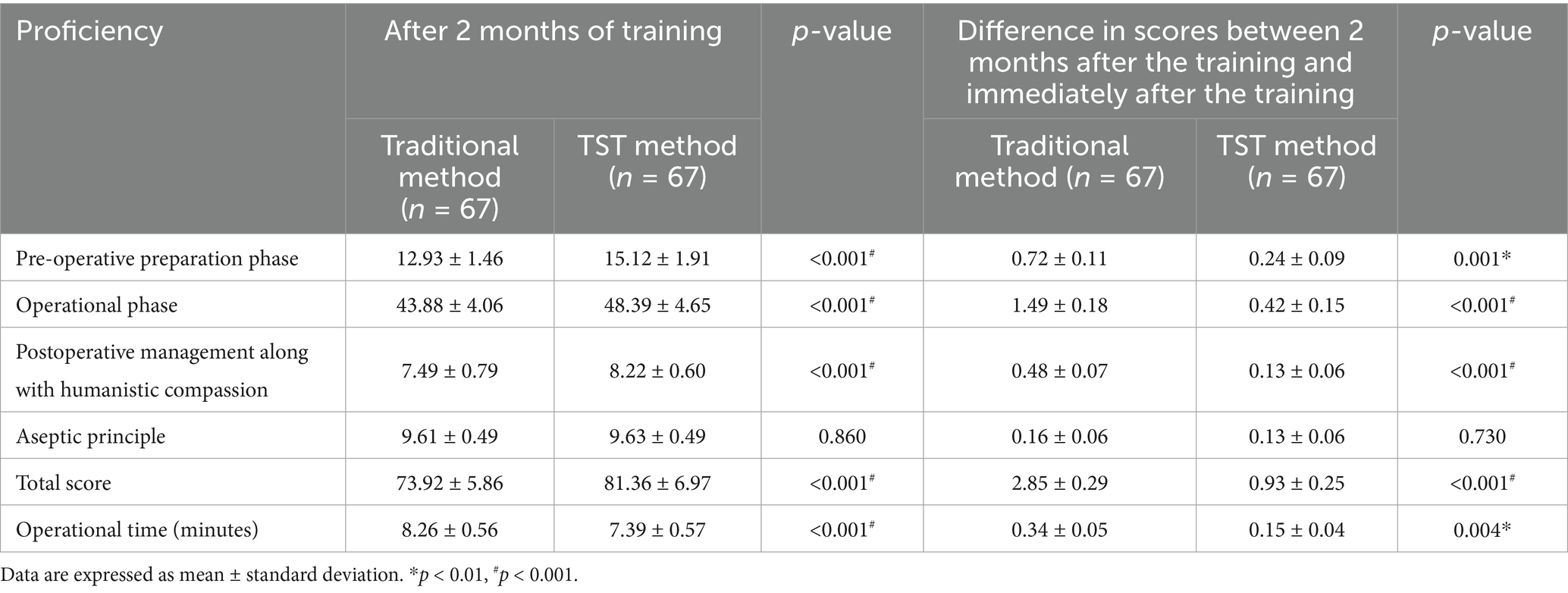 An assessment through a simulated operation was conducted by another anesthesiology teacher at 2 months after the training. All participants did not receive training on spinal puncture within the 2 months. The TST group retained a higher level of knowledge and skills related to spinal puncture. Specifically, compared to the traditional method group, participants in the TST method group demonstrated significantly higher scores in the pre-operative preparation phase, the operational phase, postoperative management along with humanistic compassion, and total scores (all p < 0.001), but the operational time was shorter (p < 0.001) (Table 3). In contrast, the difference in scores between 2 months after the training and immediately after the training in the TST group, including the pre-operative preparation phase, the operational phase, postoperative management along with humanistic compassion, and total scores were lower than those of the traditional method group (all p < 0.01). There was no significant difference in the aseptic principle scores between the two groups of participants at 2 months after the training (p = 0.860). Moreover, the difference in aseptic principle scores between 2 months after the training and immediately after the training exhibited no significant discrepancy between the two groups (p = 0.730) (Table 3). No record of any modifications was kept throughout the course of the educational intervention process.
