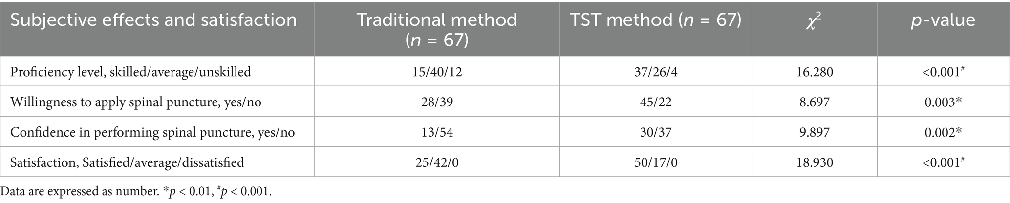 These findings have important implications for medical education. The adoption of TST as a teaching method for spinal puncture could lead to improved operational proficiency, willingness and confidence, and satisfaction with teaching.