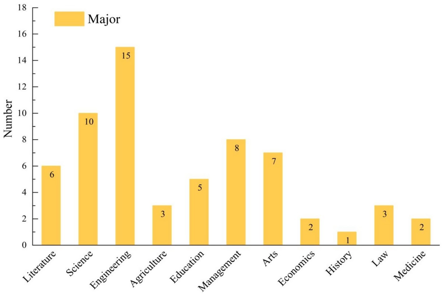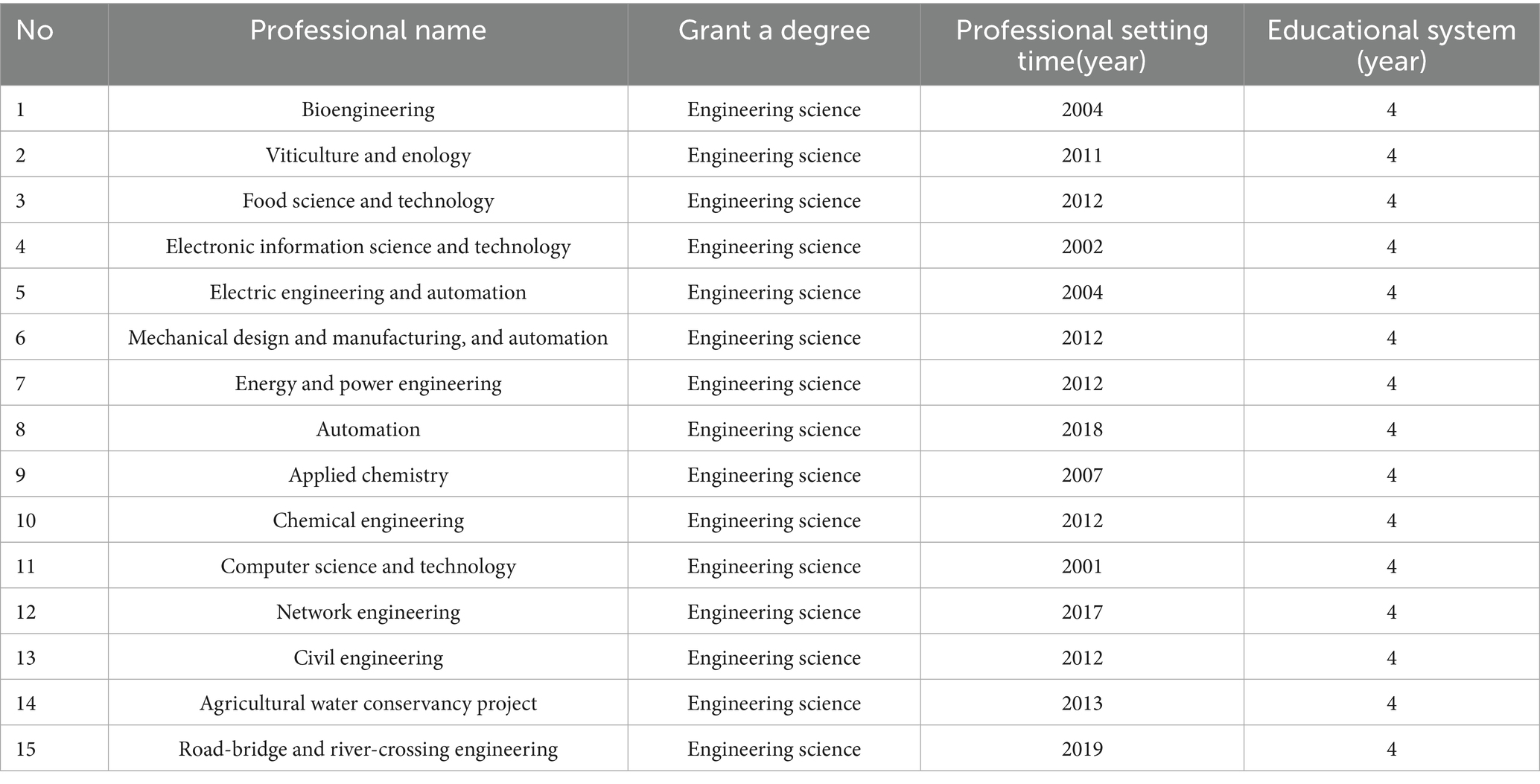 As shown in Figure 2, College X covers five major subject groups of engineering technology, agriculture, medical treatment, education, arts, and science. There are 11 disciplines, including engineering, science, literature, and other disciplines. In undergraduate studies, there are 15 engineering majors among 62 majors, accounting for the largest proportion. The 15 engineering majors are classified into five categories (Table 1). X College is a university that focuses on the training of engineering education professionals. It is representative to choose X College as a case study.