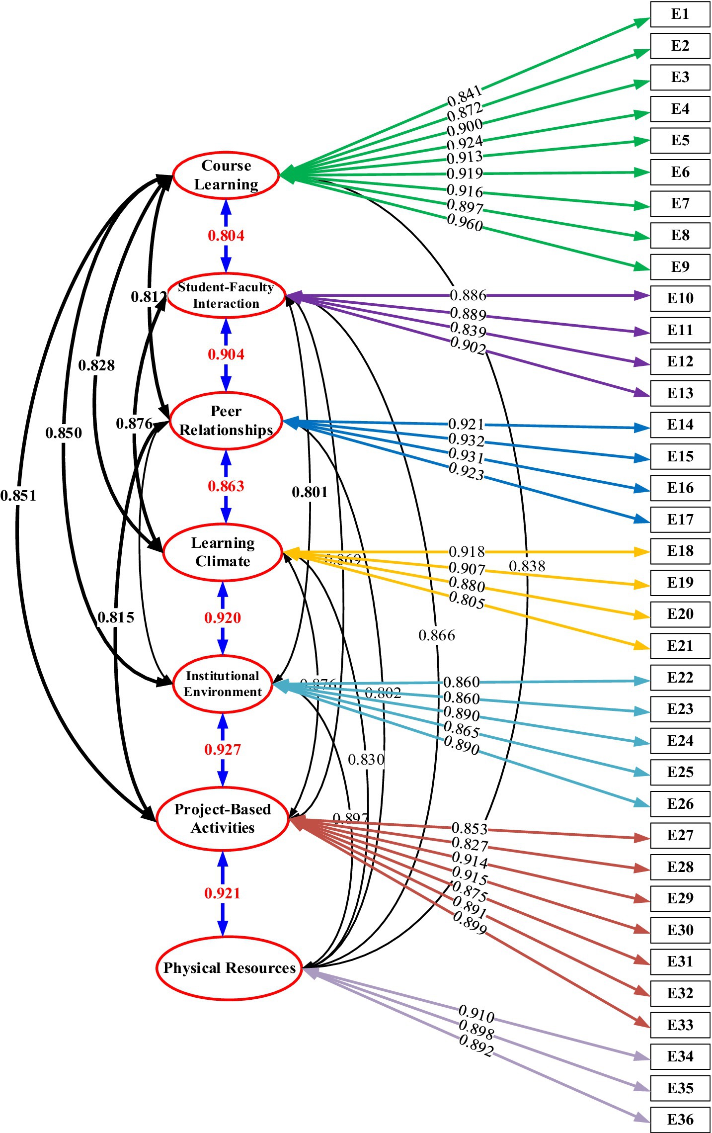 The composite reliability coefficient is generally required to be greater than 0.7. The combined reliability values of course learning, teacher–student relationship, classmate relationship, learning atmosphere, institutional environment, project and practice, and physical resources do not need to be the same. As shown in Table 6, the minimum values of these seven dimensions are greater than 0.7 and close to 1, indicating that the internal consistency of the engineering education learning environment scale is high. Among them, E1–E9 items measure the course learning factor, E10–E13 items measure the teacher–student relationship factor, E14–E17 items measure the classmate relationship factor, E18–E21 items measure the learning atmosphere factor, and E22–E26 items measure the institutional environment factor. E27–E33 items measure project and practice, and E34–E36 items measure physical resource factors.