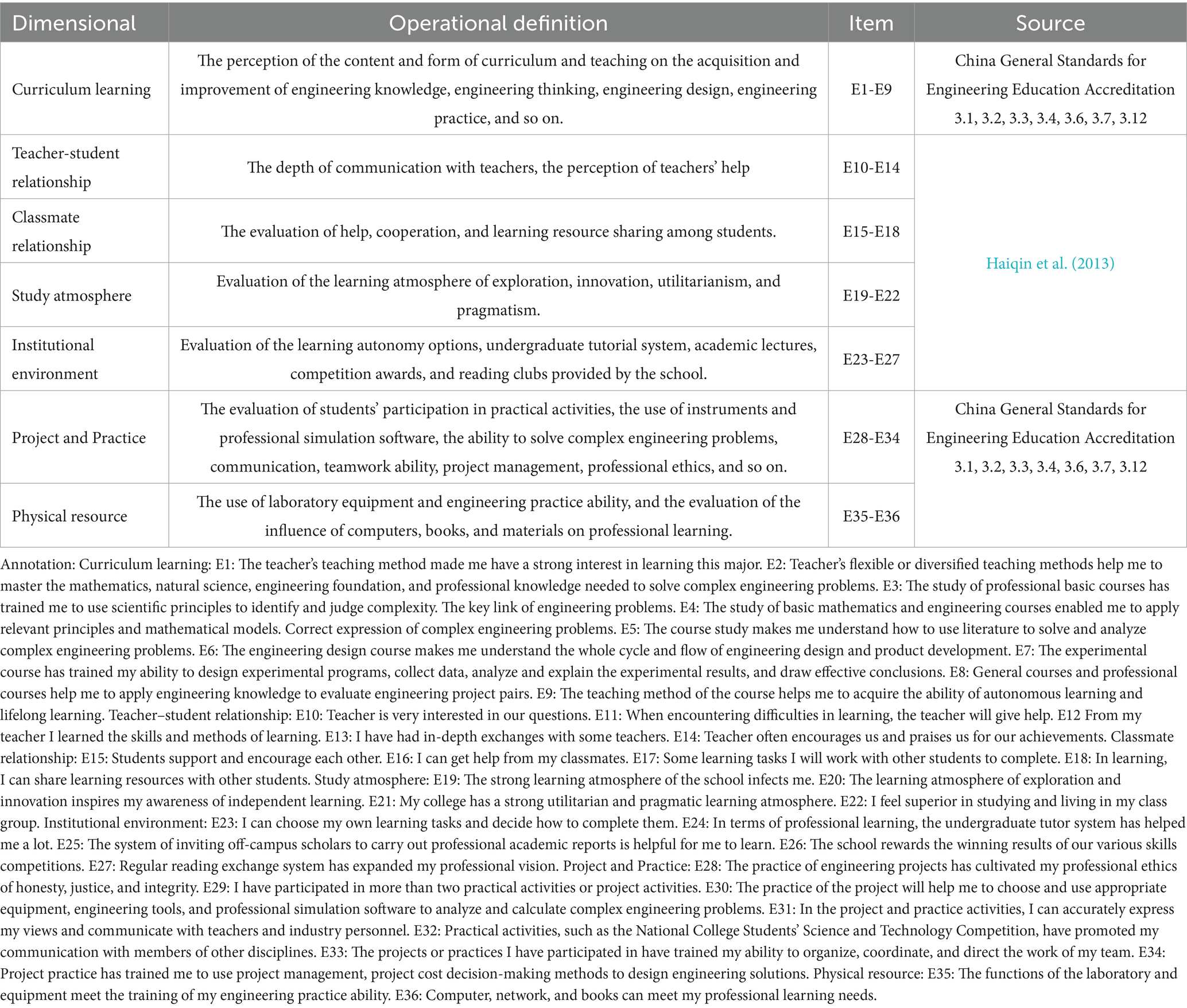 Based on the abovementioned scholars’ definition of learning environment, this study believes that the learning environment of engineering education is a collection of supportive conditions that support students to participate in the conception, design, implementation, and operation of products, and then acquire engineering knowledge, practical skills, and engineering literacy. According to the concept of CDIO engineering education, conception refers to the understanding of product requirements and technology, design refers to the description of product implementation, implementation refers to the generation of products from designed plans, and operation refers to the realization of the use value of products (Crawley et al., 2007). “Supportive conditions” include courses, practical activities inside and outside the school, systems, physical resources, and other factors that support learning and learning atmosphere, interpersonal relationships, and other regulatory factors.
