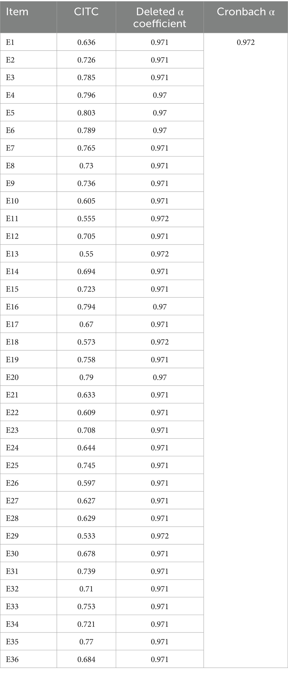 The reliability coefficient is an index to measure the consistency and stability of measurement tools or test results (Tang et al., 2024). Scholars mostly use the total correlation coefficient (CITC) and internal consistency reliability coefficient of the revised items to screen the effective items of the questionnaire. CITC refers to the correlation coefficient between the measurement item and other items in the same measurement dimension. The CITC value of the item is less than 0.3, which needs to be deleted to improve the reliability of the questionnaire (Daiwen, 2002).
