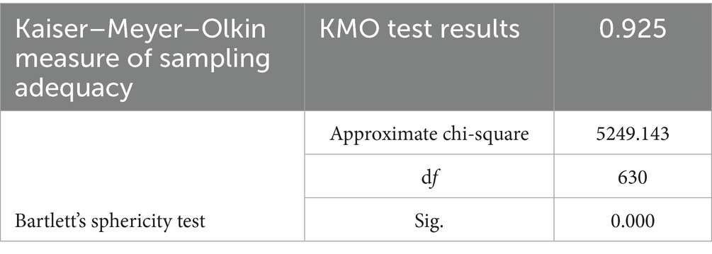 After passing the CITC and α coefficient test, it is necessary to carry out exploratory factor analysis on the questionnaire. Items with the same attributes are classified into one dimension to test the discriminant validity of each dimension. KMO and Bartlett spheres. The Bartlett Test of Sphericity is used to test whether there is a correlation between variables, which is the basic condition for exploratory factor analysis. The larger the KMO value, the better the correlation of each variable is measured, and factor analysis can be performed (Qingguo, 2002). The null hypothesis of Bartlett’s spherical test is that the correlation matrix has a single dimension. When the test results show a statistically significant level, the null hypothesis is rejected, indicating that the questionnaire has multiple dimensions and is suitable for factor analysis.