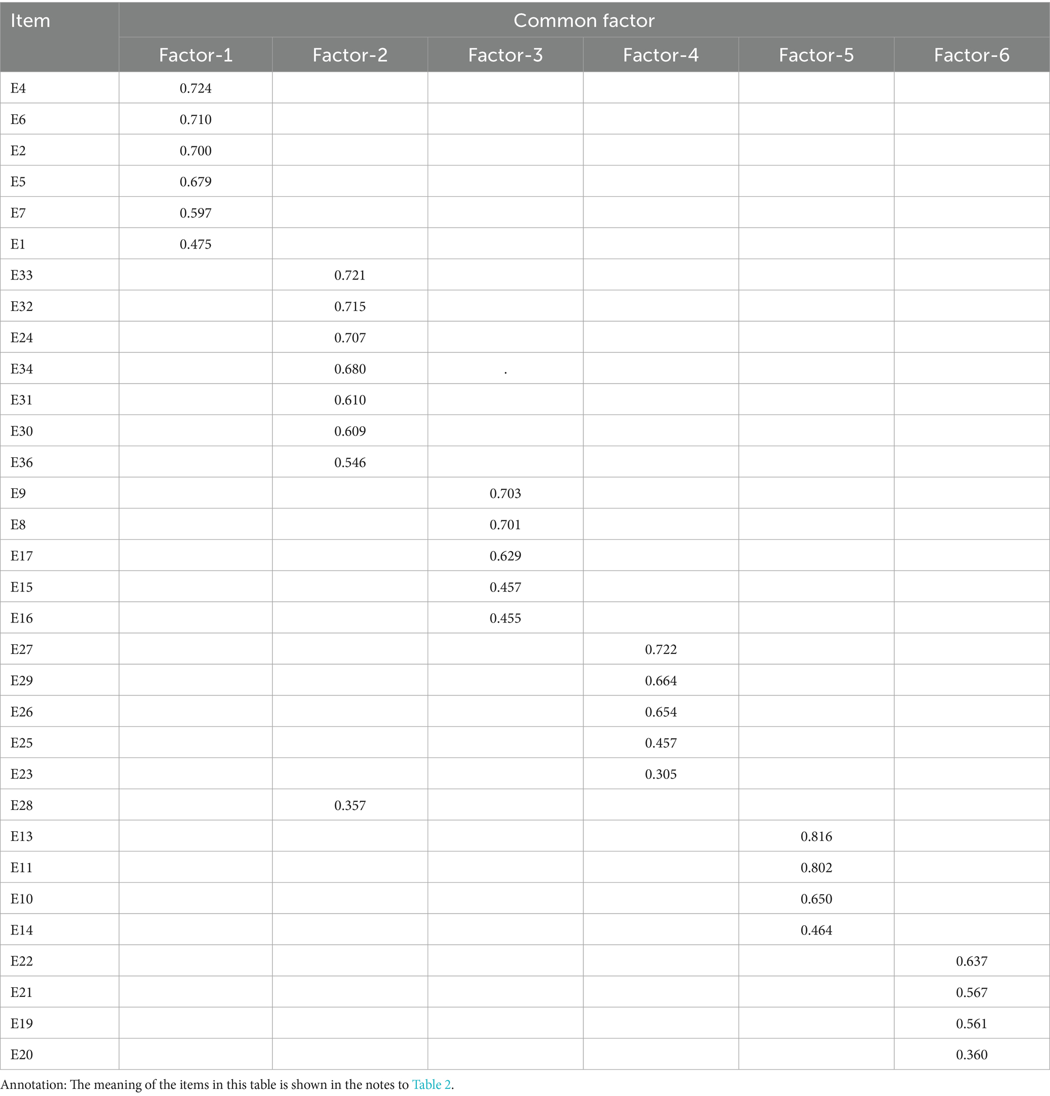 EFA is an analysis method of factor dimension reduction, which can realize the fusion of observation variables into several common factors, and construct all item information with several common factors. Principal component analysis (PCA) is used to calculate the explanatory variation of the item, and then explain the variation of the data. The factors with initial characteristic roots greater than 1 are obtained by the maximum variance orthogonal rotation method. Exploratory factor analysis test results. If the factor load is less than 0.5, the project needs to be deleted according to the existing literature.