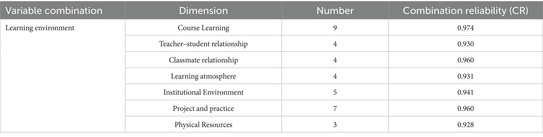 The study further developed a learning environment assessment scale for engineering education, which includes seven dimensions: ‘course learning, teacher–student relationship, classmate relationship, learning atmosphere, institutional environment, project and practice, and physical resources’. The research hypothesis is proposed: (H1) The evaluation structure of the learning environment of engineering education consists of seven dimensions; the (H2) scale has good CITC, internal consistency reliability, content validity, and composite reliability, and there is no common method bias.