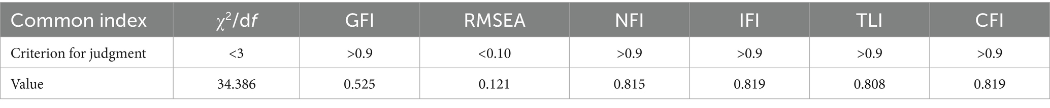 The fitting test of this study mainly uses GFI, RMSEA, NFI, IFI, TLI, CFI, and other indexes. Among them, GFI (goodness of fit index) represents the fitting index, and the closer its value is to 1; it represents the fitting degree of the theoretical model and the measurement model. The smaller the value of RMSEA (root mean square error of approximation), the better. If the value is less than 0.10, the model is acceptable. NFI, IFI, TLI, and CFI are judged based on values greater than 0.9. The closer the value is to 1, the better the fitting degree is. The χ2/d f value generally increases with the increase of the sample, and it is not used as the basis for judging whether the model fitting degree is better in the study.
