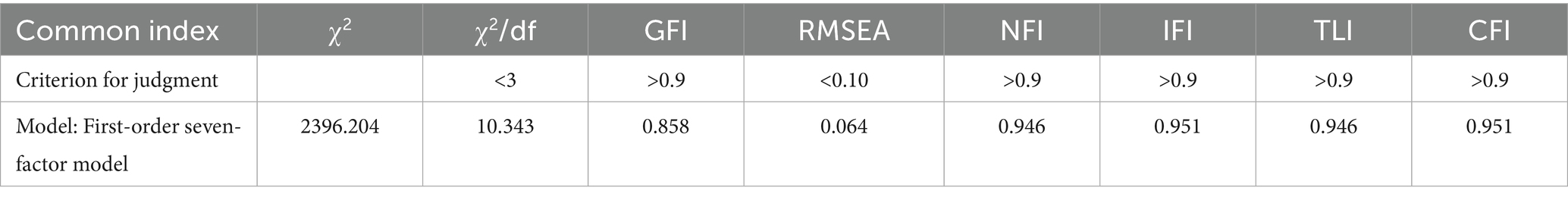 After predictive exploratory factor analysis, some items of the predictive scale are deleted and added. It is assumed that the learning environment theory of engineering education is a first-order seven-factor model, and the fitting index of the model is shown in Table 8.