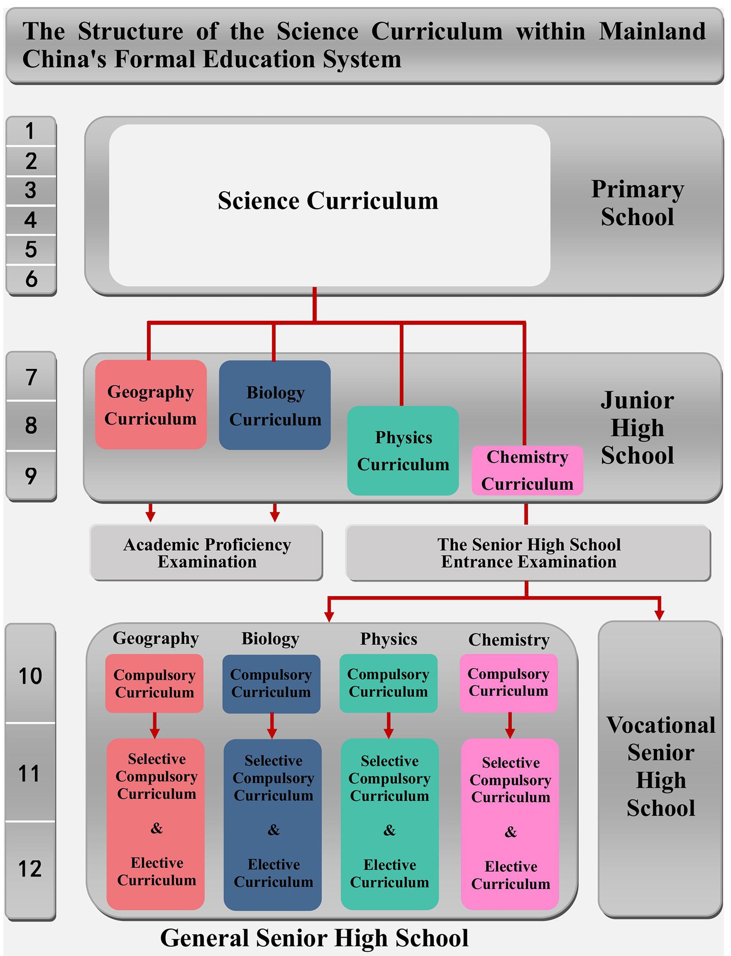To facilitate international academic understanding and comparative research, it is necessary to explain the structure of the science curriculum within the formal education system of mainland China (Figure 1). Mainland China follows a branched system of education, where all school age children follow the same curriculum structure during the compulsory education phase (Grades 1–6 as primary school, Grades 7–9 as junior high school). The branching occurs in Grades 10–12, where students are admitted into either general senior high schools or vocational senior high schools based on their performance in the Senior High School Entrance Examination. The complete science curriculum is implemented throughout the entire compulsory education phase and in general senior high schools, whereas vocational high schools offer only partial science subjects with simplified content compared to those in general senior high schools. During compulsory education, all school age students receive a uniform science curriculum. At the primary level, an integrated science course is provided under the unified subject title “Science” (The Ministry of Education of the People’s Republic of China, 2022a). At the junior high school level, the science curriculum is generally subject based, with biology and geography taught in Grades 7–8, physics introduced in Grades 8–9, and chemistry taught in Grade 9. At the senior high school level, the science curriculum continues to follow a subject structure, covering physics, chemistry, biology, and geography, and is further divided into three modules: compulsory courses, selective compulsory courses, and elective courses (The Ministry of Education of the People’s Republic of China, 2020a). Under this framework, all students are required to complete the compulsory modules in Grade 10 and pass the Senior High School Academic Proficiency Test, which serves as a basic requirement for graduation. Students who choose certain science subjects as part of their elective selection for the Nationwide Unified Examination for Admissions to General Universities and Colleges will systematically study two additional types of course modules in that subject, namely selective compulsory courses and elective courses, during Grades 11–12. The elective courses are not mandatory.