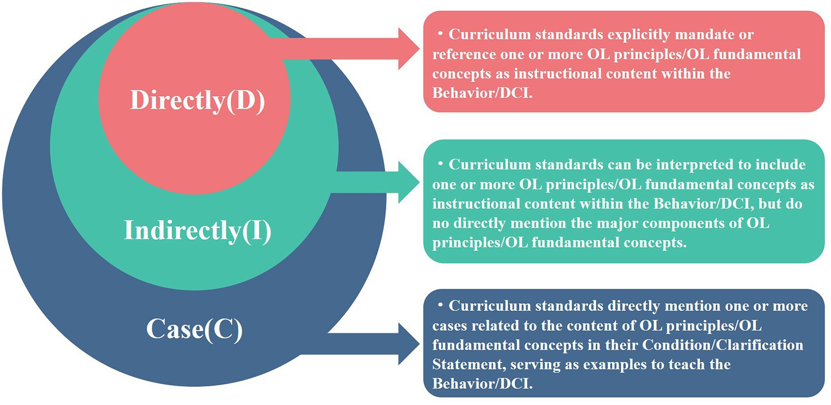 To ensure the internal discriminability of the OL review results, this study integrates the DIF grading scale proposed by Hoffman and Barstow in Revolutionizing Earth System Science Education for the 21st Century (Hoffman and Barstow, 2007), and the 4-point scale rating system proposed by NMEA in Alignment of the ocean literacy framework to the NGSS (National Marine Educators Association Ocean Literacy Committee, 2015), to develop a grading scale applicable to the OL review in this study. This grading scale was established through a consultative process with experts in the field of science education. The Directly and Indirectly levels were inherited from the DIF grading scale, but their scope of application was refined to focus specifically on instructional content. The Case level is derived from point 3 in the NMEA grading scale, with its applicability further restricted, assigned only when the science curriculum standards explicitly include instructional cases related to OL. All grading ranks were revised according to the statements of the Chinese and U.S. science curriculum standards. Figure 2 presents the detailed structure of this grading scale.