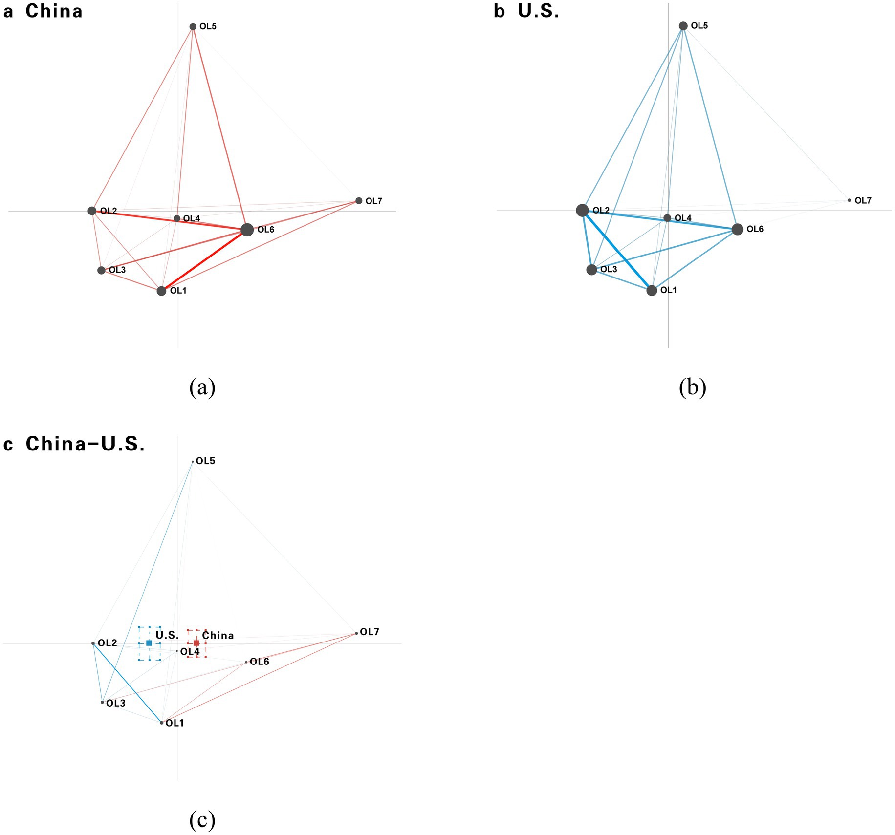 The size of the nodes and the thickness of the connecting lines reflect the similarities and differences between the OL epistemic networks of China and the United States at the micro level (Shaffer et al., 2016). China’s OL cognitive network demonstrates a strong central structure: with OL6 serving as the core hub, it forms high-intensity associations with OL1 and OL2, and also shows moderate radial connections with other nodes (OL3, OL4, OL5, OL7); while only weak connections or no direct associations are found among the remaining nodes (e.g., OL3–OL5, OL4–OL7, OL5–OL7). In contrast, the OL epistemic network of the United States exhibits a polycentric structure, where OL1, OL2, OL3, and OL6 are interconnected through dense links, forming a high-intensity “ocean system” epistemic network. However, OL7 shows low connectivity with other OL principles.