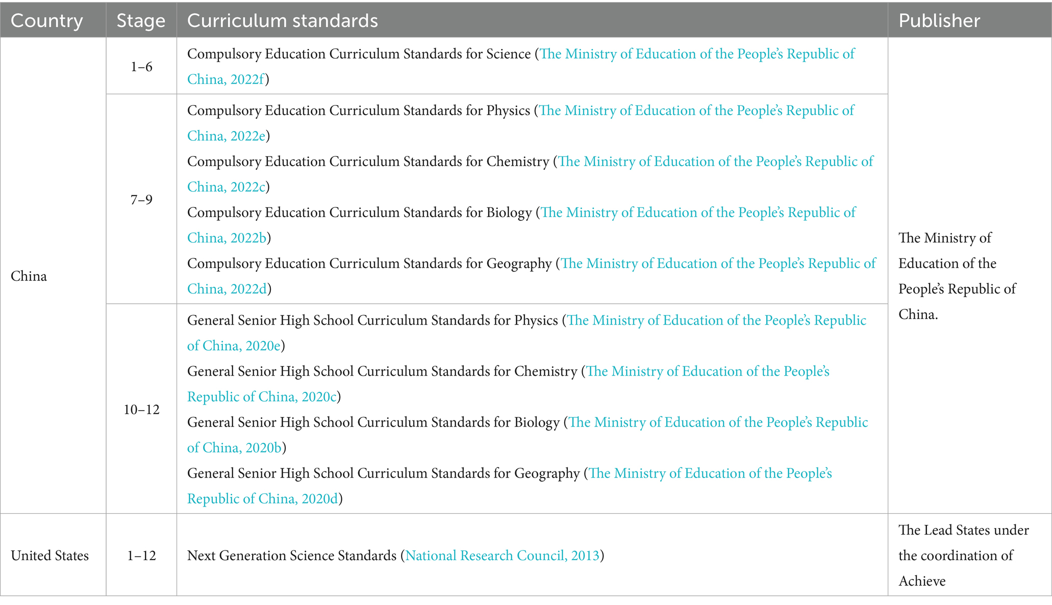 Table 1. Research documents (the discrepancy in the number of curriculum standards documents reviewed between China and the United States does not affect the validity of the study’s findings).