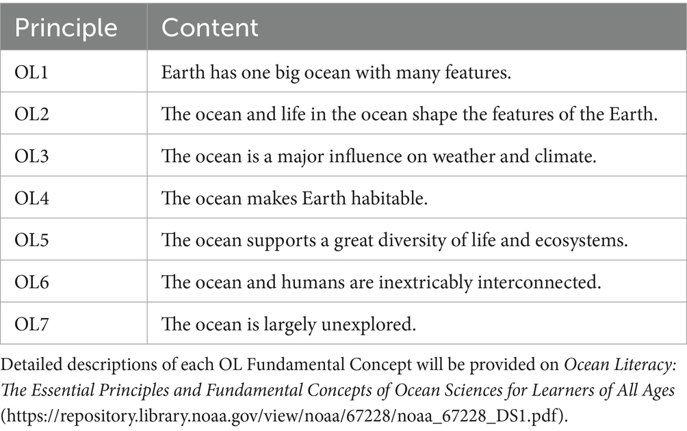 From a developmental standpoint, OL was jointly proposed by ocean scientists and educators, and one of the primary motivations for its emergence was to address the lack of ocean-related content in U.S. science education standards (McKinley et al., 2023). The proposal of OL was not merely intended to fill a gap. From its inception, it was conceived as an interdisciplinary educational framework (National Marine Educators Association, 2024). This is evident in its inclusion of content that goes beyond the boundaries of traditional scientific disciplines and emphasizes integrative science. In practice, OL encompasses content from physical science (PS), life science (LS), geographical science, environmental studies, and other subjects, most of which are generally classified under the science curriculum at the basic education level.