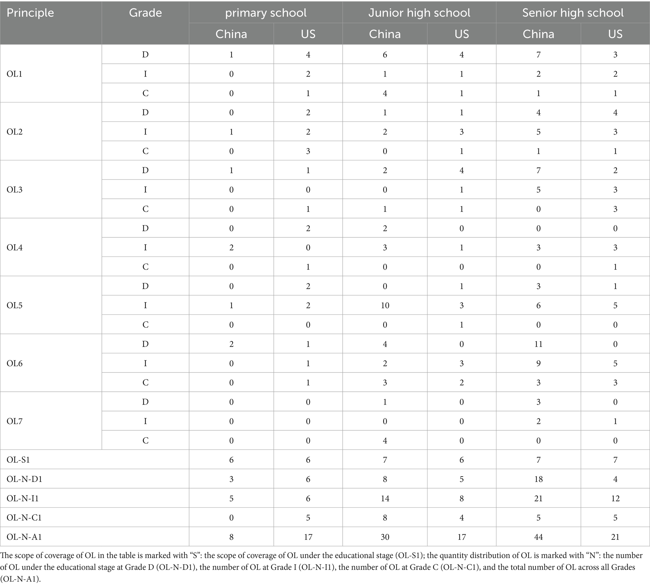 Table 3 reveals the scope of coverage, quantity distribution, and grading ranks of OL in the science curriculum of China and the United States from the perspective of educational stage. The data of OL-S1 indicate that the OL scope of coverage in both countries includes six or more OL principles across all educational stages. The analysis of OL-N-A1 data across educational stages shows that China’s OL quantity exhibits a clear stepwise increase and surpasses that of the United States at the junior and senior secondary stage, whereas the U.S. demonstrates a more balanced distribution across all stages. This difference may stem from the divergent approaches to the development of science curriculum standards in the two countries. In mainland China, the unified science curriculum standard implemented in primary education shifts to subject based curriculum standards at the secondary stage. This allows curriculum developers of each subject to elaborate on subject knowledge in greater detail, thereby providing broader opportunities for the inclusion of OL. By contrast, the United States adopts a continuous K–12 science curriculum standards, which maintains the continuity and coherence of the science education. Finally, a comparison of the grading ranks of OL in different educational stages reveals that Grade I is the primarily grading rank in both countries across all stages.