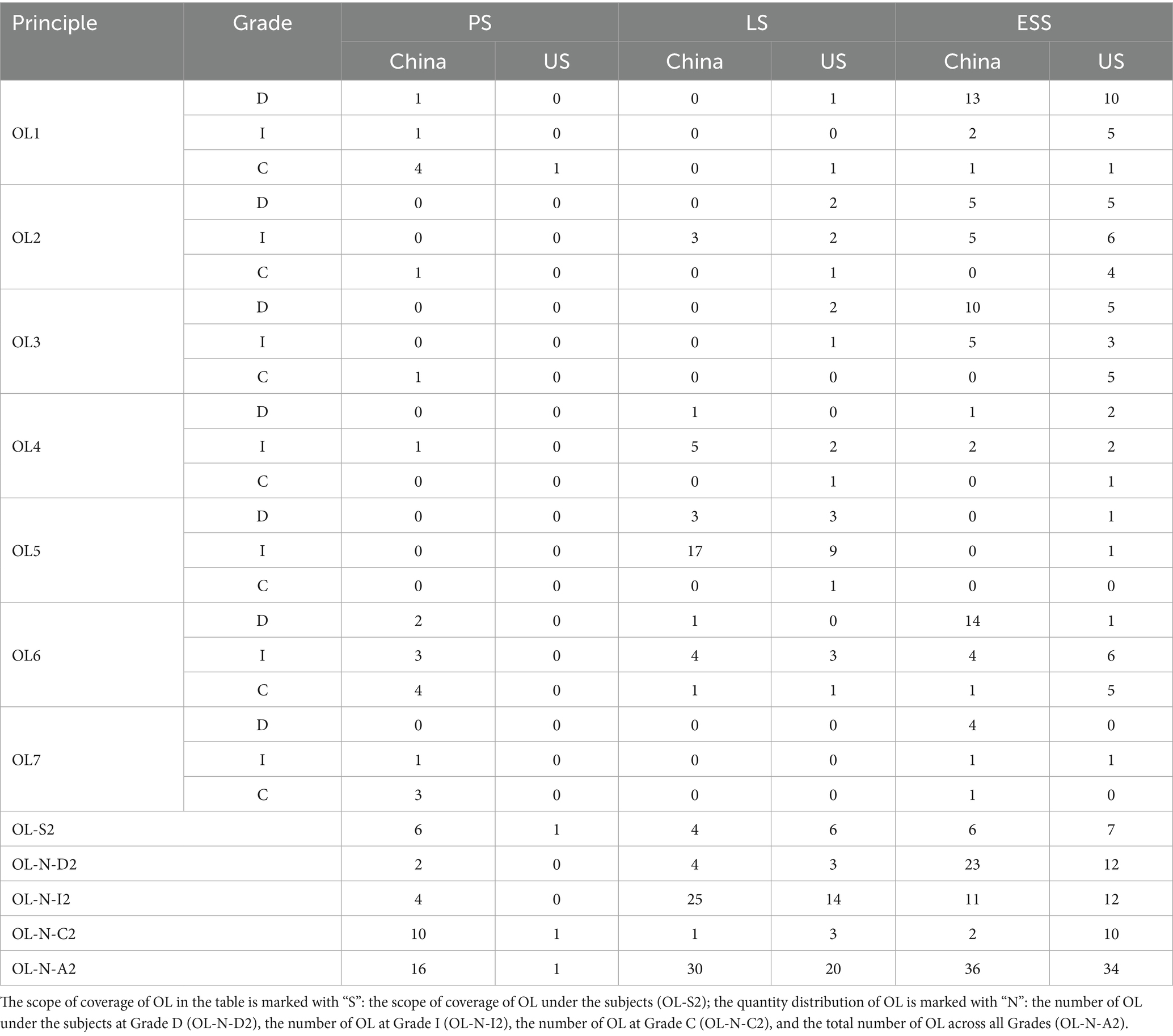 Continuing with a comparative analysis of how OL is incorporated into the PS, LS, and ESS in China and the United States. First, in PS, China places greater emphasis on OL. In this subject, China retrieved six OL principles (OL1, 2, 3, 4, 6, and 7) and 16 curriculum standards, whereas the United States retrieved only one OL principle (OL1) and one curriculum standard. This is an notable finding, as previous studies have consistently reported difficulties in retrieving evidence of OL in PS curriculum documents (McPherson et al., 2018; Pazoto et al., 2021). Second, in LS, a contrast emerges between the two countries: the United States addresses OL more comprehensively, encompassing six OL principles (OL1, 2, 3, 4, 5, and 6) through 20 curriculum standards, whereas China, despite retrieving 30 curriculum standards in total, incorporates only four OL principles (OL2, 4, 5, and 6). Notably, three of the four Grade D curriculum standards identified in China fall within the senior secondary elective module Marine Biology, whose non-compulsory nature may constrain the effective implementation of OL in this subject. Third, in ESS, the two countries exhibit the closest overall performance. The United States covers all seven OL principles in this subject, while China includes six (OL1, 2, 3, 4, 6, and 7). In terms of quantity, China retrieved 36 curriculum standards, slightly exceeding the 34 identified in the United States; however, 12 of these belong to senior secondary elective geography modules, whose non-compulsory status may constrain effective implementation. A more detailed comparison shows that both countries prioritize OL1 in ESS, with China placing greater emphasis on OL3, OL6, and OL7, while the United States focuses more on OL2, OL4, and OL5.