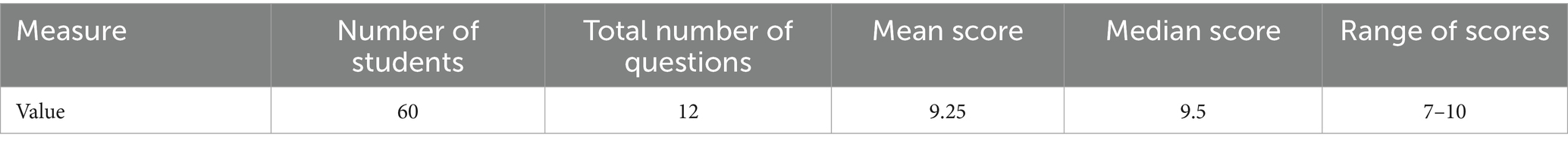In Table 2, “Measure” represents the statistical measure being reported, and “Value” represents the corresponding value calculated from the pre-assessment results of the selected sample of top scorers. These statistics provide a concise summary of the data’s central tendency, variability, and distribution.
