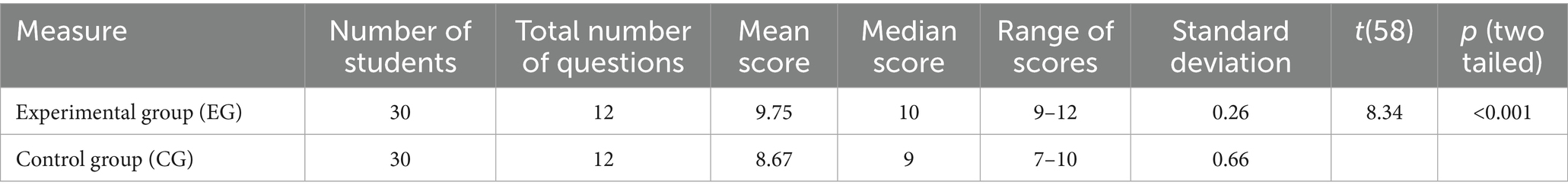 The comparative statistics gathered from the EG and CG are displayed in the Table 3.
