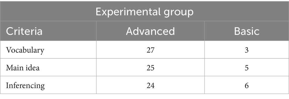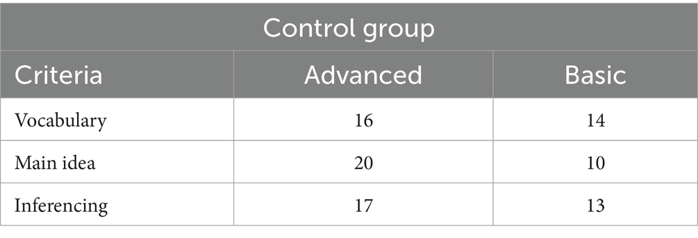 As the results were examined according to the provided rubric in Table 1, detailed values were processed for the CG and EG showing number of the participants at each level for the measured variables as shown in Tables 4, 5, respectively.