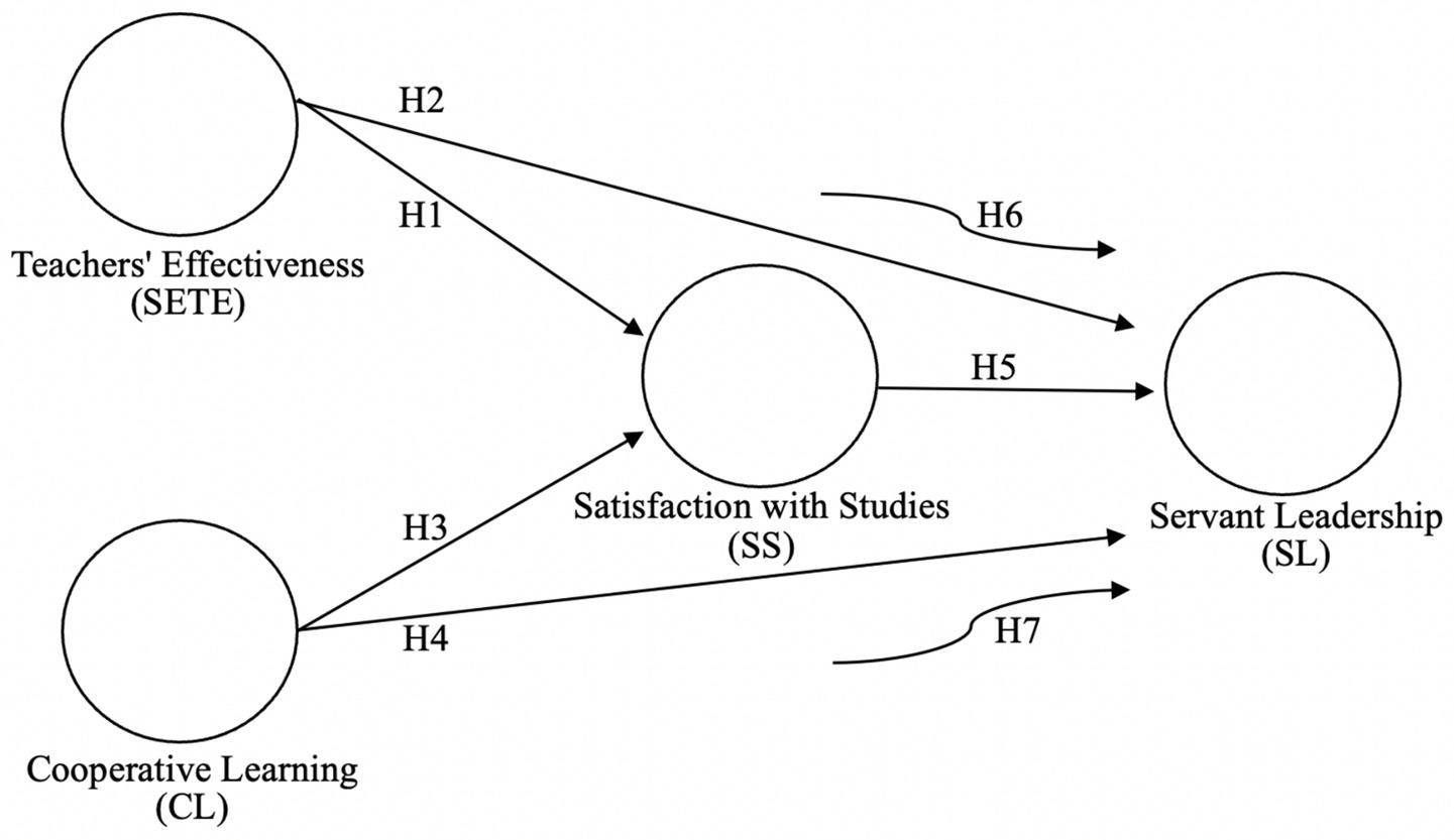 The hypotheses were supported, observing the effect on satisfaction with studies of both teachers’ effectiveness (β = 0.185; p = 0.000; t = 6.297) and cooperative learning (β = 0.358; p = 0.000; t = 11.491); and the effect on servant leadership of both teachers’ effectiveness (β = 0.122; p = 0.000; t = 4.247), cooperative learning (β = 0.576; p = 0.000; t = 21.186), and satisfaction with studies (β = 0.151; p = 0.000; t = 7.734). Likewise, the results indicate the mediating role of satisfaction with studies in the effect of teachers’ effectiveness on servant leadership (β = 0.028; p = 0.000; t = 4.784), and of cooperative learning on servant leadership (β = 0.054; p = 0.000; t = 6.531). This new model suggests a re-evaluation of existing models on these topics. The results of this research provide a valuable perspective for higher education management and leadership that seeks to achieve higher levels of satisfaction with studies among Latin American university students. This perspective deserves special attention in future research, including the exploration of other potential factors and the application of these findings in diverse contexts and cultures.