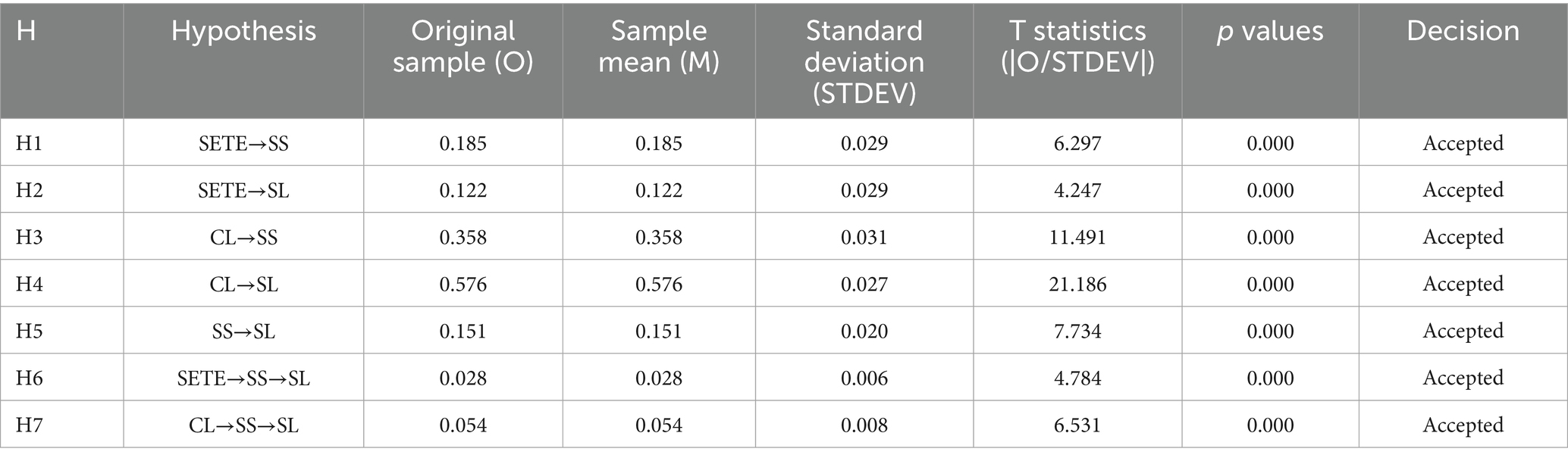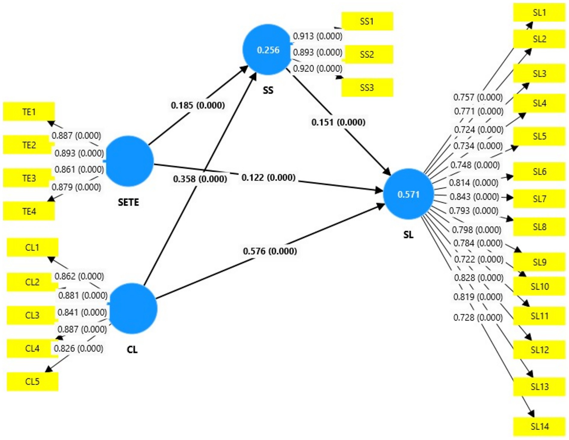 Hypothesis testing and path coefficient evaluation can be seen in Table 5. Results show that teachers’ effectiveness (SETE) positively influences satisfaction with studies (SS; β = 0.185; p = 0.000; t = 6.297) and servant leadership (SL; β = 0.122; p = 0.000; t = 4.247), supporting hypotheses H1 and H2. Results also show that cooperative learning (CL) positively influences satisfaction with studies (SS; β = 0.358; p = 0.000; t = 11.491) and servant leadership (SL; β = 0.576; p = 0.000; t = 21.186), supporting hypotheses H3 and H4. Likewise, it is also validated that satisfaction with studies (SS) positively influences servant leadership (SL; β = 0.151; p = 0.000; t = 7.734), which supports hypothesis H5. In addition, these results support that satisfaction with studies (SS) mediates the positive influence of teachers’ effectiveness (SETE) on servant leadership (SL; β = 0.028; p = 0.000; t = 4.784), and that it also mediates the positive influence of cooperative learning (CL) on servant leadership (SL; β = 0.054; p = 0.000; t = 6.531), which is why hypotheses H6 and H7 are accepted.