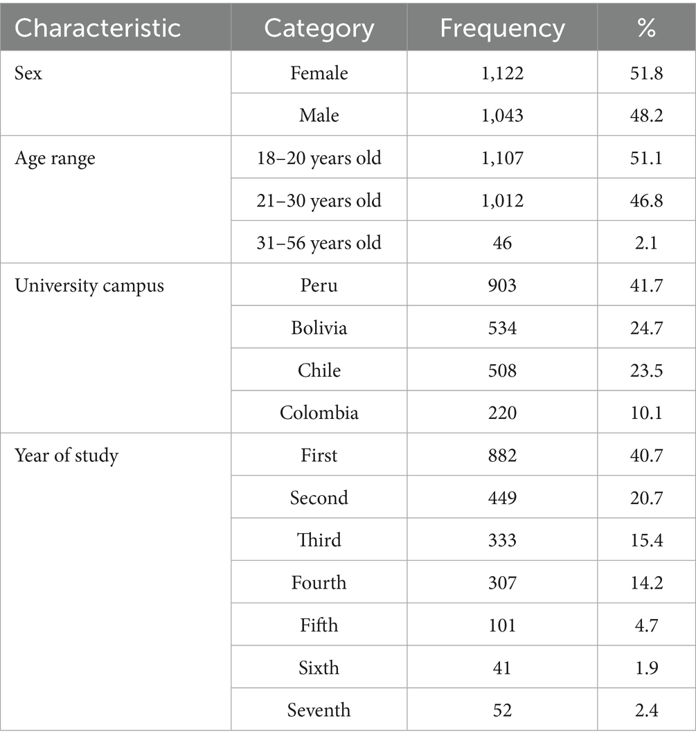 Non-probability convenience sampling was used to collect data for this research (Otzen and Manterola, 2017). This type of sampling allowed for the selection of easily accessible cases due to the proximity of the respondents to the research team; they were university students who were willing to participate, and were more easily accessible due to their schedules, courses, or study methods, and homogenous extracurricular activities. Participants were approached in a variety of settings, such as large gatherings, study halls, campus rest centers, libraries, university cafeterias and convenience stores, and at various social events. The Soper (2024) electronic tool was also used. This tool takes into account the number of variables, both observed and latent, in the SEM, along with the anticipated effect size (λ = 0.2), the desired level of statistical significance (α = 0.05), and the required statistical power (1–β = 0.80). Based on these parameters, it was determined that 342 university students needed to be included in the sample. However, a total of 2,165 university students participated, with an almost equal distribution between women (51.8%) and men (48.2%), with ages ranging from 18 to 56 years (M = 21.26; SD = 3.48). The inclusion criteria stipulated those participants had to be over 18 years of age and enrolled in the in-person modality at eligible universities. Individuals who did not meet the age and study modality criteria were excluded. The majority of participants were between 18 and 20 years old (51.1%), were studying on-campus in Peru (41.7%) and were in their first year of university studies, representing 40.7%, as shown in Table 1.