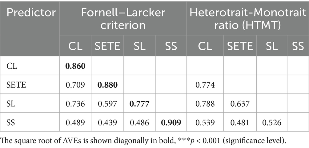 Henseler, J., Ringle, C., and Sarstedt, M. (2015). A new criterion for assessing discriminant validity in variance-based structural equation modeling. J. Acad. Mark. Sci. 43, 115–135. doi: 10.1007/s11747-014-0403-8