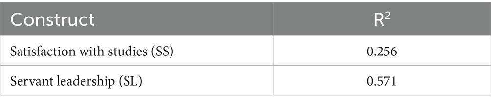 The proposed hypotheses were tested using the PLS-SEM technique. Predictive relevance values were used for model fitting. Cross-validated redundancy values (R2) represent the model’s predictive relevance. As reported by Hair et al. (2014) and Henseler et al. (2015), R2 values should be greater than 0 for model accuracy. R2 values were determined using the blindfolding method where all endogenous construct values were greater than 0, representing model accuracy. The endogenous latent variables with their respective R2 of the present work for both satisfaction with studies (SS) and servant leadership (SL) were 0.256 and 0.571, respectively (see Table 4). That is, the R2 values had acceptable to substantial values.
