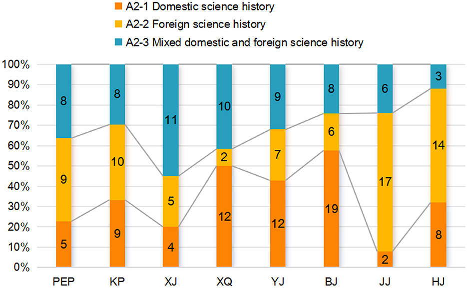 The placement of HOS content within textbooks reflects the editors‘ pedagogical intentions and considerations of learning logic. As shown in Table 4, presenting HOS content via main body integration (B2-2) and supplementary reading (B2-3) is the most common strategy adopted across all versions. The introductory context (B2-1) approach is used less frequently, and the use of the exercises and assessments (B2-4) strategy is observed least frequently. A closer examination of inter-version differences reveals that the XJ (n = 5, 25.0%), XQ (n = 6, 25.0%), and BJ (n = 8, 24.2%) versions use the introductory context more frequently. This suggests an emphasis on stimulating learning interest and promoting active thinking through historical scenarios. Conversely, the PEP (n = 9, 40.9%) and JJ (n = 13, 52.0%) versions are notable for embedding HOS content directly within the main text, which is a method that strengthens the connection between historical narratives and core subject matter, thereby enhancing learning coherence and the systematic presentation of materials. The KP (n = 16, 59.3%), YJ (n = 12, 42.9%), and HJ (n = 12, 48.0%) versions, following yet another strategy, tend to feature HOS content predominantly in the supplementary reading sections. The latter are designed with diverse reading and inquiry tasks to broaden students' knowledge horizons and cultivate critical thinking skills. The BJ version demonstrates the greatest diversity in positional context, enriching the channels through which students can access the HOS content.
