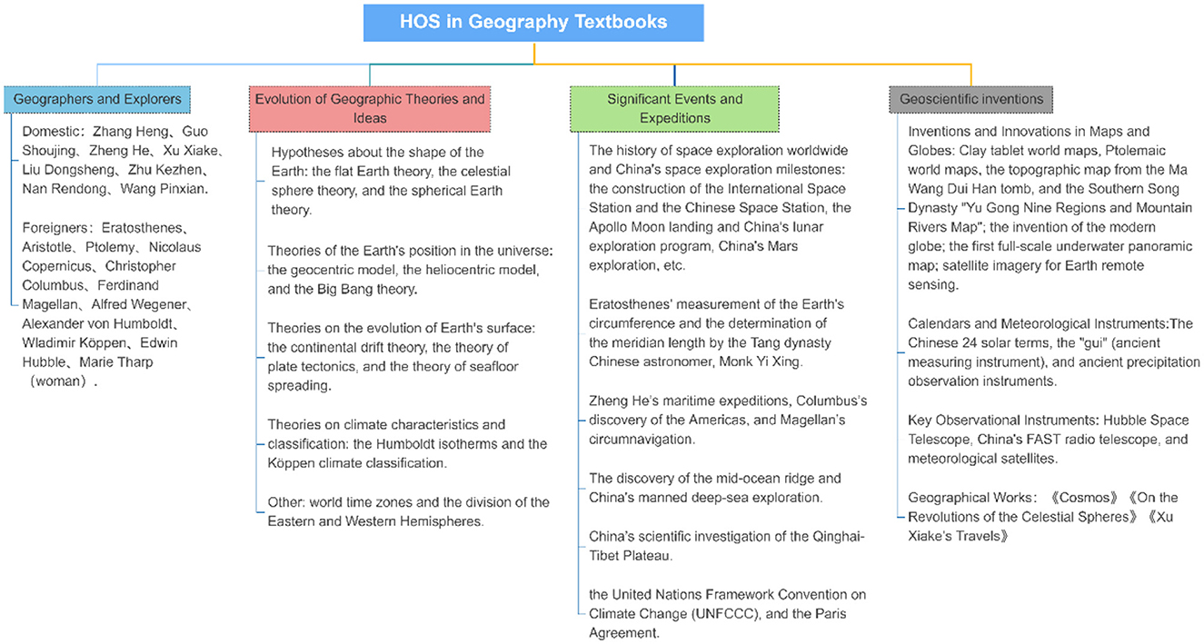 Within the Chinese educational context, the geography curriculum functions as the principal carrier of earth science education. It is an integrated course that synthesizes diverse natural science topics, including geology, meteorology, and environmental science, while simultaneously emphasizing the human-environment relationship and spatial systems thinking, thereby offering a unique vantage point for cultivating SL (Duan and Ding, 2025; Xuan et al., 2019). This distinctive role can be attributed to both the long-standing history and the disciplinary inclusiveness of geography in China. Historically, Chinese geography evolved from early descriptive accounts of geographical knowledge, through the modern era's analytical exploration of spatial laws, toward the contemporary capacity for simulating and predicting complex human–environment systems, a trajectory that closely parallels the development of earth system science. The inclusion of HOS in geography is particularly salient because it represents an “evolutionary atlas of geospatial cognition” that comprises the historical methods of discovering, understanding, and evaluating geographic phenomena (Martin, 2008). This approach helps students comprehend spatial differences on the Earth's surface and explore the methodologies used to explain them. However, a debate persists in China's curriculum reform regarding the disciplinary positioning of “earth science” vs. “geography,” with some scholars questioning the efficacy of the current system to adequately cultivate SL (Hu, 2024). It is hypothesized that the inadequate integration of HOS may be a contributing factor to this perceived deficiency. Nevertheless, this proposition lacks empirical validation, highlighting a critical need for research that investigates the status of HOS within China's secondary school geography textbooks.