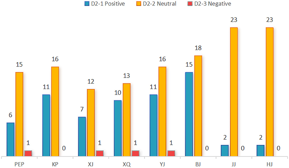 As illustrated in Figure 4, the attitudinal orientation of HOS content is predominantly neutral (D2-2) or positive (D2-1), with the negative (D2-3) orientation occurring notably infrequently. This general trend underscores a curricular emphasis on the objectivity inherent in the natural sciences. A more granular analysis, however, uncovers divergent approaches among the publishers. The JJ and HJ versions, for instance, adopt discernibly more neutral stances. These textbooks prioritize an authentic and objective portrayal of the development of geographical science and its societal context. By carefully balancing expressions of national identity with a commitment to scientific integrity, they maintain a consistently impartial tone. In stark contrast, the remaining versions display a more pronounced positive orientation. The latter texts frequently highlight exemplary aspects of traditional Chinese culture, the arduous struggles of its people, and national achievements in science and technology. The narratives are often infused with laudatory and affirmative language that is strategically used to cultivate a sense of national pride among students. Beyond this dichotomy, some versions also integrate discussions of contemporary challenges facing both the discipline of geography and society at large. This inclusion serves a clear pedagogical purpose to motivate students to study geography and contribute to national development, thereby fostering a heightened sense of civic responsibility.