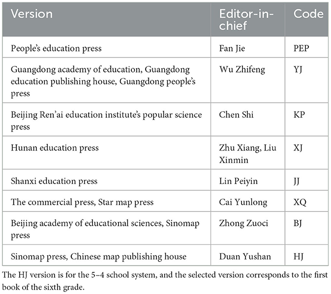 The research sample for this study consists of eight of the ten MOE-approved versions of junior high school geography textbooks as of September 2024. The analysis focuses specifically on the content of the first-semester Grade 7 textbooks. The selection of these materials was guided by the following criteria. (1) Richness of HOS Content: This academic level was chosen because its curriculum standards mandate content with significant potential for HOS integration. A preliminary review by our research team confirmed that the “understanding the globe” module, which covers topics such as the cosmic environment, the Earth's movements, and the Earth's surface systems from a global perspective, provides a systematic context for incorporating HOS and aligns well with the objectives of this study. (2) Representativeness and Comparability: The selected textbook versions command a substantial market share and exhibit representative and comparable content structures. Two textbook versions were excluded from the sample: the Shandong Education Press version, due to its content being largely identical to that of the People's Education Press (PEP) version, and the China Cartographic Publishing House version, which was omitted because of its significantly different organizational structure. Detailed information on the final sample is presented in Table 1.