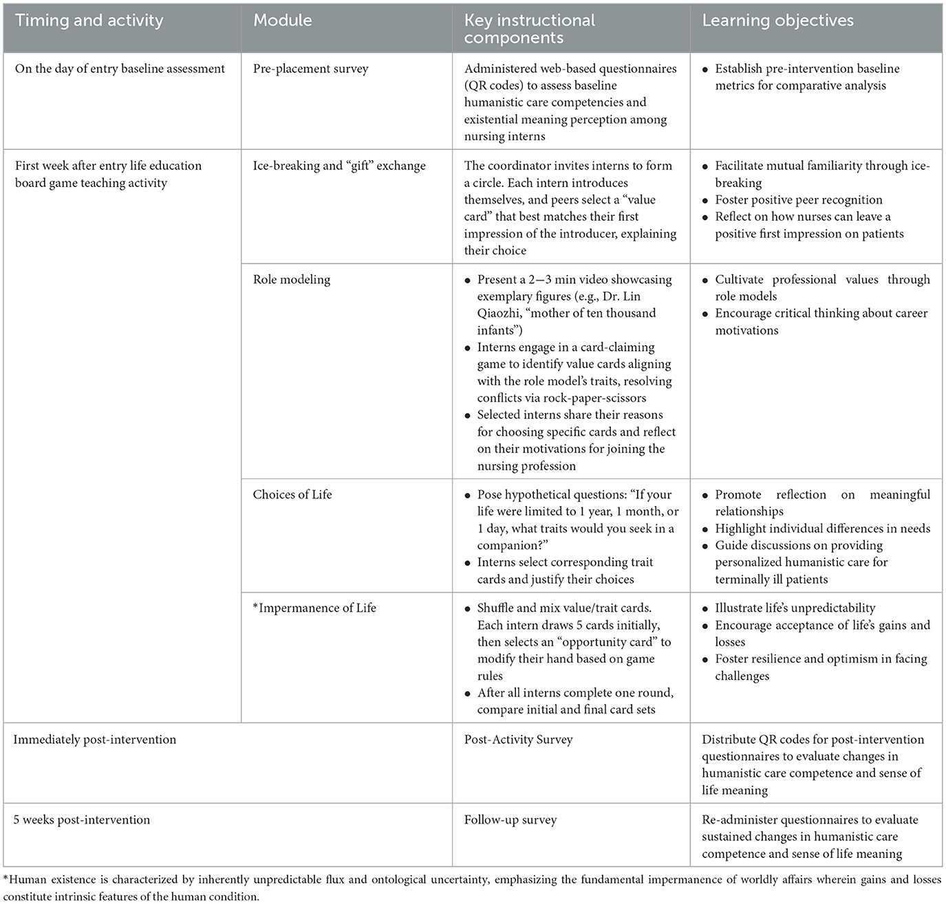 During the first week of the nursing interns‘ rotation, the life education board game activity was conducted in the demonstration room of their respective departments. The department's nursing education leader served as the activity organizer, facilitating the session, distributing cards, and guiding interns in discussions. Six to 10 nursing interns participated in the activity, while the head of the hospital nursing education management team supervised the entire process and collected feedback through interviews. Web-based surveys assessing the interns' humanistic care abilities and sense of life meaning were administered immediately before and after the activity, followed by group interviews to gather feedback from both interns and department nursing education leaders. A third web-based survey was conducted during the sixth week of the internship, just before the interns completed their rotation in the department.