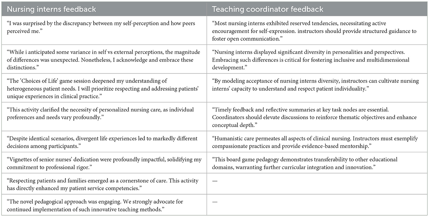 Feedback from nursing interns and teaching leaders on life education board game teaching activity is shown in Table 5.
