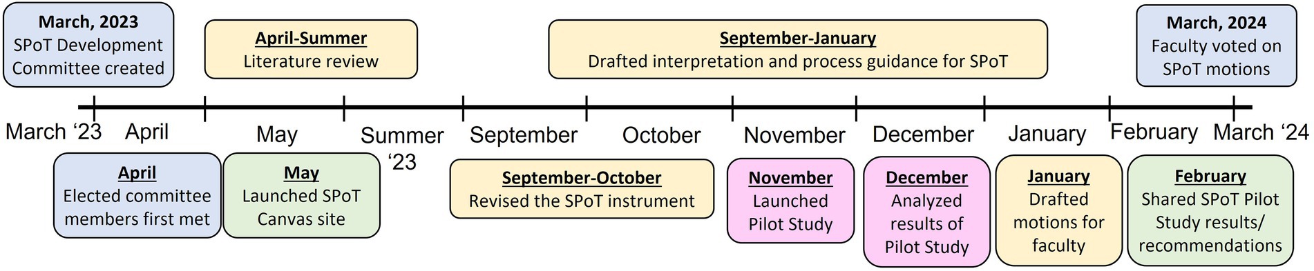 Timeline detailing the SPOT committee’s activities from March 2023 to March 2024. Key milestones include committee creation in March 2023, literature review by summer, SPOT instrument revision by September-October, pilot study launch in November, analysis in December, motions drafted in January, results shared in February, and faculty voting in March 2024.