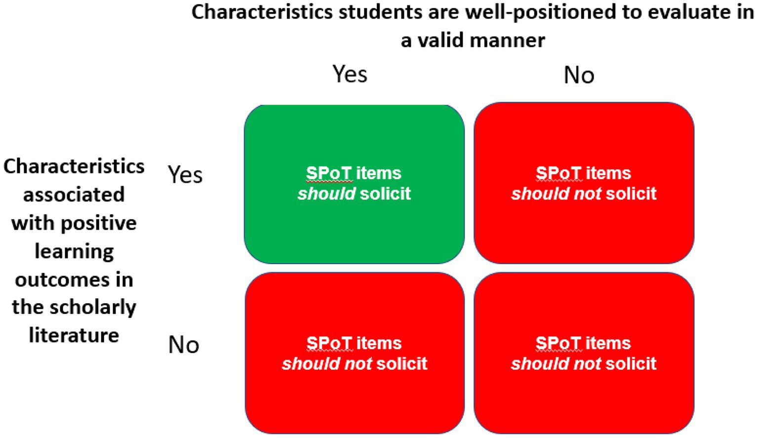 Our committee’s work began with an extensive review of scholarship on effective teaching, positive learning outcomes, and the assessment of teaching in college environments. Drawing from this research, our committee identified a list of teaching constructs that the SPoT items should solicit information about and a parallel list of constructs that the SPoT items should not solicit information about. The should category included aspects of teaching that students are well-positioned to assess in a valid manner and that have been associated with positive learning outcomes (Chickering and Gamson, 1987; Freeman et al., 2014; Simonson et al., 2022). The should not category included aspects of teaching that students do not have the expertise to evaluate, have not been associated with positive learning outcomes, or have been prone to bias in the literature on teaching assessment. Figure 2 provides a graphic representation of this approach.