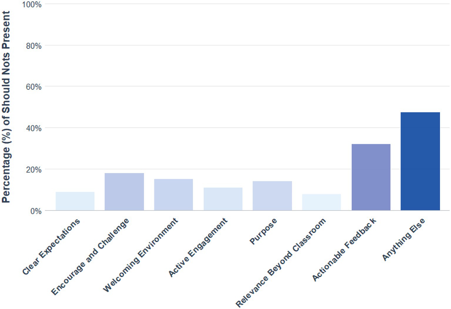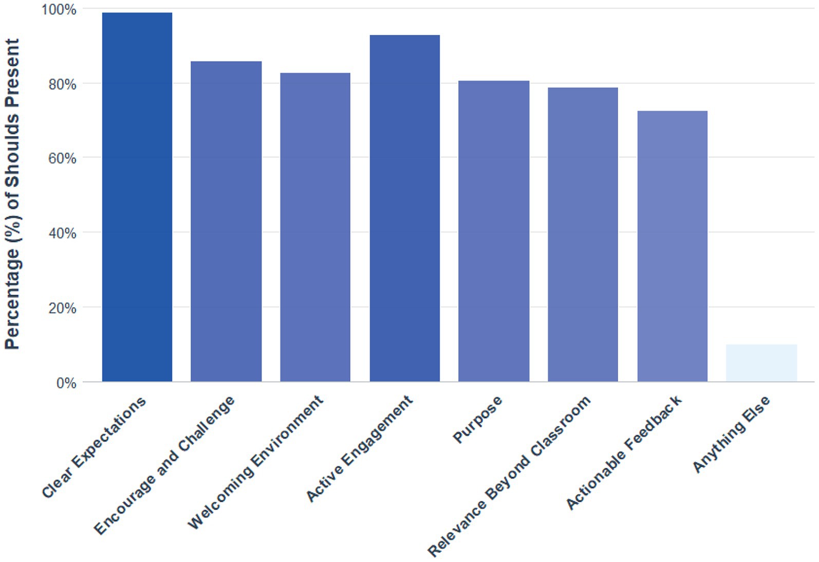 Bar chart showing the percentage of “shoulds” present across various categories. “Clear Expectations” is at almost 100%, “Encourage and Challenge” at 80%, “Welcoming Environment,” “Active Engagement,” “Purpose,” “Relevance Beyond Classroom,” and “Actionable Feedback” range around 80-70%. “Anything Else” is less than 10%.