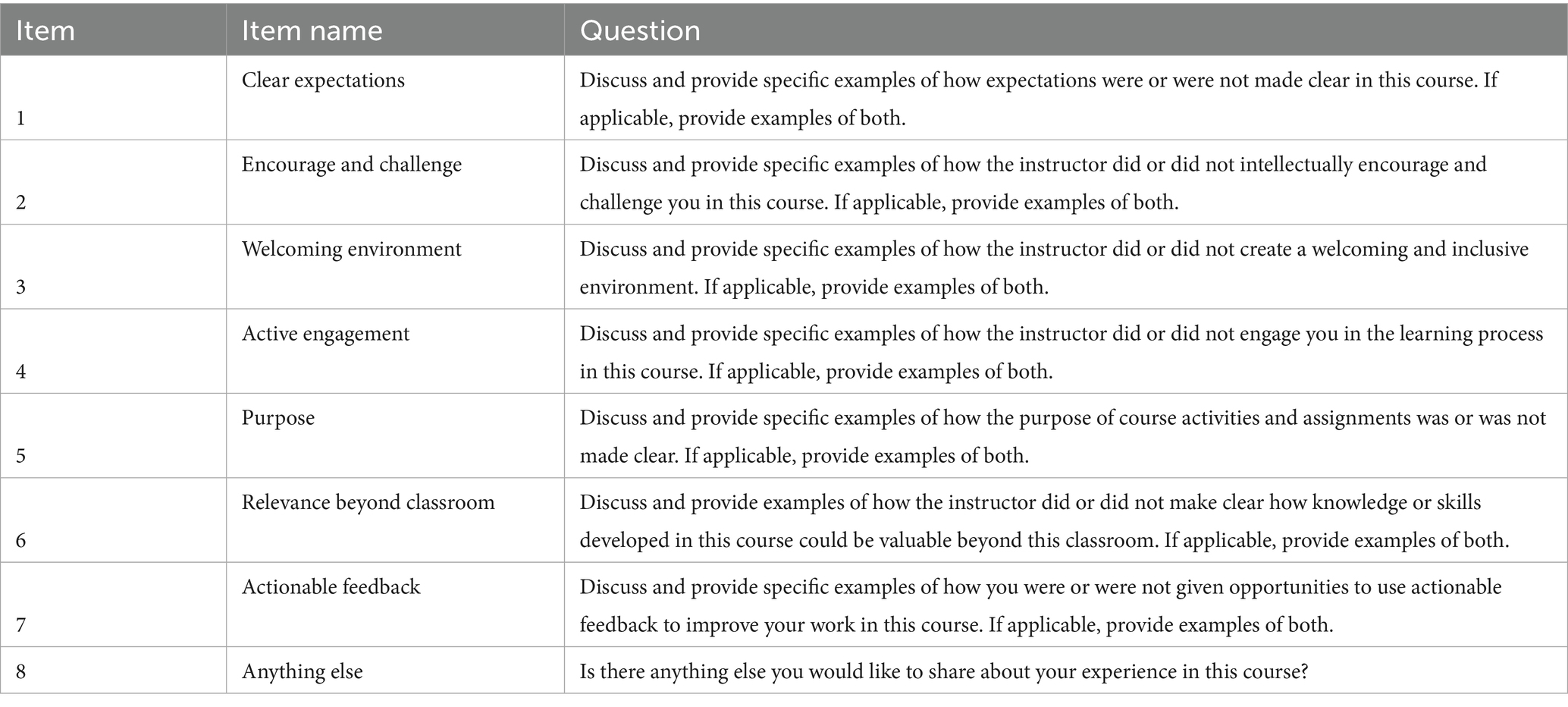 Clear expectations arise from a shared understanding of instructor and student roles and responsibilities inside and outside of the classroom. For students, clarity of instruction is critical for achieving pedagogical goals (Simonson et al., 2022). The successful communication of expectations reduces barriers to learning and allows students to optimize assigned work, and clarity of a greater purpose provides rationale for activities and shows respect for student effort (Simonson et al., 2022). Students are well positioned to evaluate whether or not guidelines, roles, and expectations are made clear to them in class and in course documents. Clear expectations may also facilitate improved instructor-student interactions (Dennen et al., 2007) and course completion (Handal et al., 2011). Furthermore, a shared understanding of expectations builds trust and agency in the teacher/student relationship, resulting in further gains (Deci and Ryan, 1985).