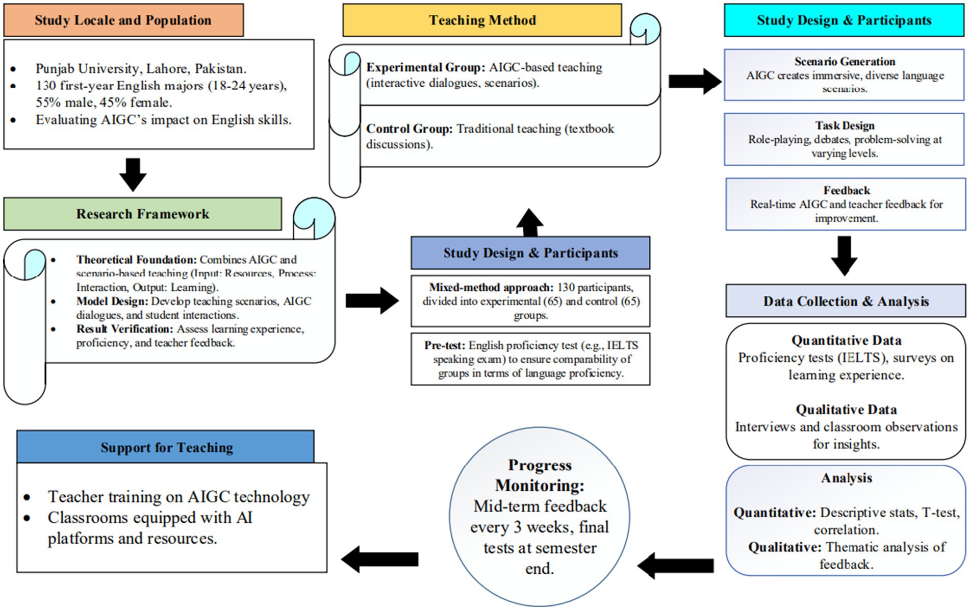 This study was conducted at the University of Punjab, located in Lahore, Pakistan. The participants of the study were 130 first year students with English language as their major. Their age ranged between 18 and 24 years and are assessed as having an intermediate level of English proficiency. The population consisted of the 55% Male and 45% Female students, representing the typical demographics of first year English Majors. All the selected participants were enrolled in an English conversational course to evaluate the effectiveness of AIGC technology in the improvement of the language skills at the university level. The overall methodology of this study is shown in Figure 1.